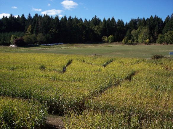 If you don’t happen to know what a corn maze is, let me explain. (If you do, I’ll be quick.) Basically, you start with a large cornfield, and then you cut away cornstalks to create paths that follow a maze pattern. Sounds simple enough. But how they do it, I’d love to know.