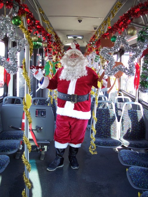 I had a brand-new Christmas experience this year when I visited the Santa Bus. The Santa Bus, you say? Apparently, in the weeks leading up to the Big Day, Santa lets the reindeer rest and tools around town on public transit. Actually, and more accurately, he and his elf Holly drive the bus to a dozen or so elementary schools. The kids get to visit with Santa, and Holly leads them in singing carols. But it’s not all fun and songs. Santa and Holly take the opportunity to talk to the children about bus safety, an important topic for youngsters who take public transit to get to school.