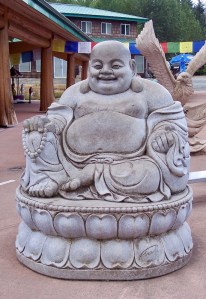 But in the square itself, arranged without apparent rhyme or reason, are dozens of stone statues of Buddhist figures, marine creatures, and land animals. Here, dogs don’t play poker; they drive cars.