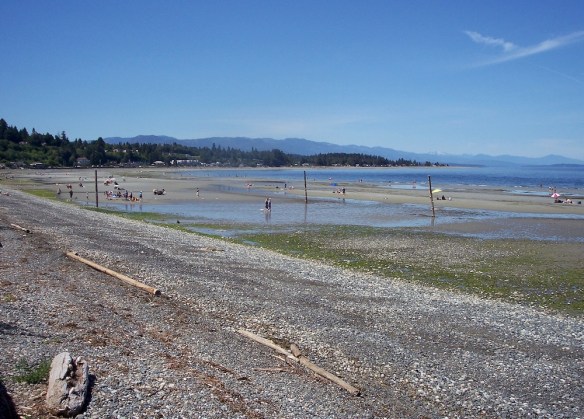 In Qualicum Beach (and even more so in Parksville), the water goes out…and out…and out. As a result, the rocks-and-pebbles shoreline becomes a wide sandy beach for several hours, leaving shallow tidepools for exploring and a soft surface for long, leisurely strolls.